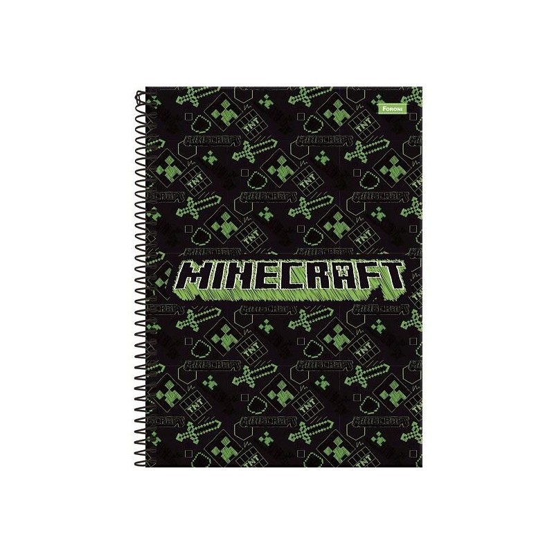 O caderno espiral universitário Minecraft possui capa dura com laminação fosca, parte interna decorada, bolsa plástica para guardar trabalhos e anotações, folha de adesivos, folhas pautadas e espiral preto.