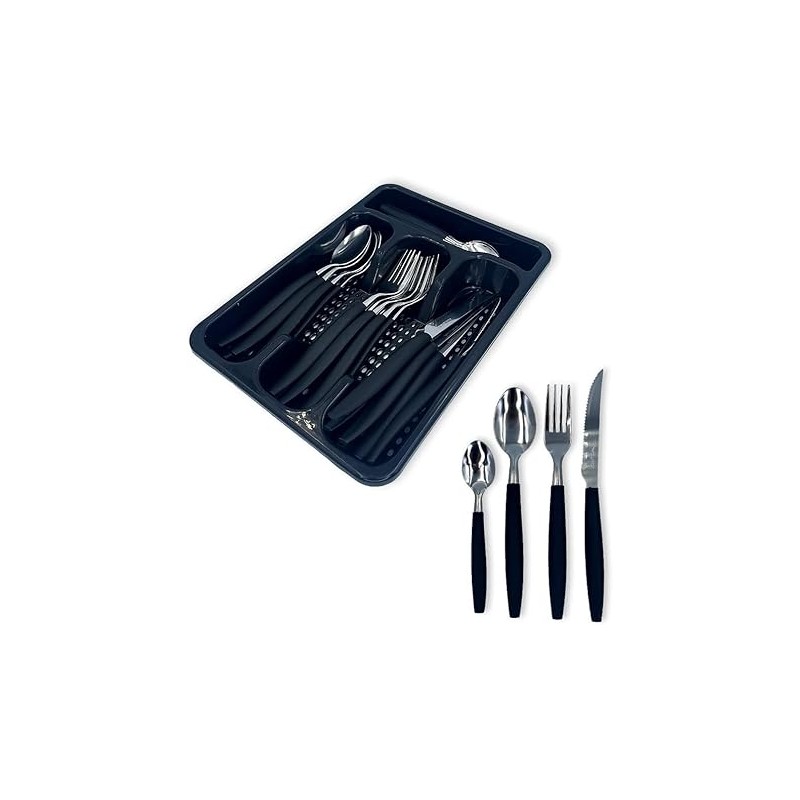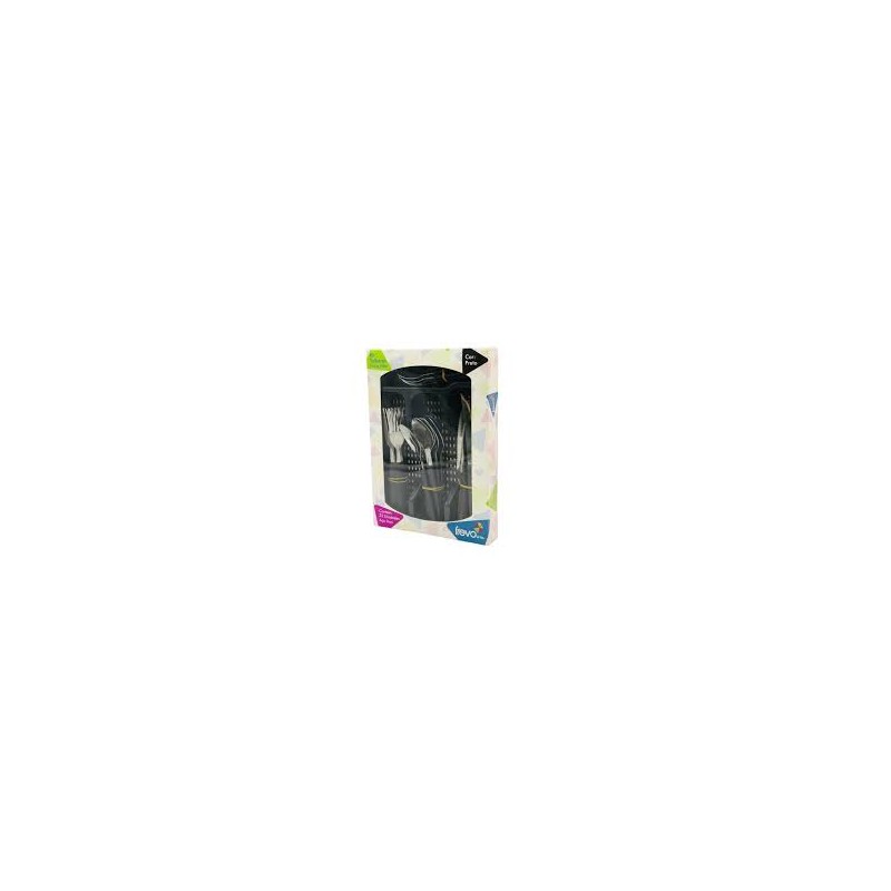 Kit talheres com 25 peças: 6 colheres de mesa, 6 garfos de mesa, 6 facas de churrasco, 6 colheres de chá e um porta talher.