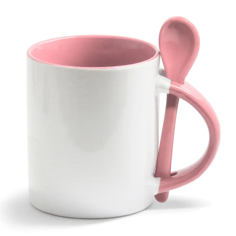 CANECA DE CERÂMICA BRANCA PARA SUBLIMAÇÃO COM COLHER E INTERIOR COLORIDA 325ML